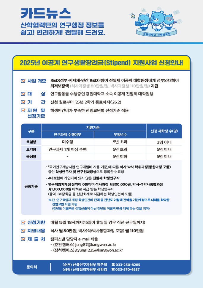 ★ 2025년 이공계 연구생활장려금(Stipend) 지원사업 신청안내 ★