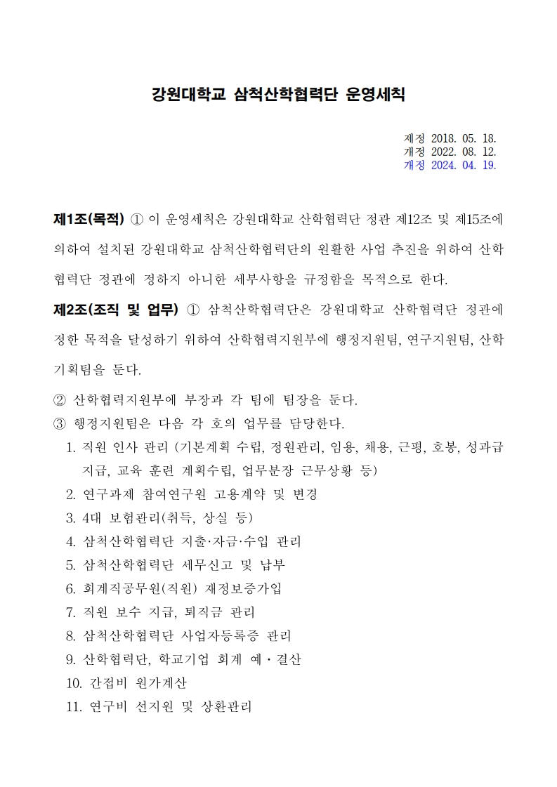 강원대학교 삼척산학협력단 운영세칙(2024.04.19.)